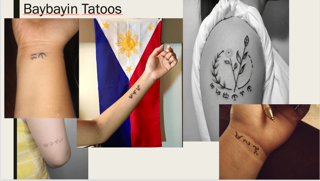 The reason for learning Baybayin is to represent and educate people about what Philippines was like during its pre-colonisation. I’ve looked at baybayin tattoos as I felt that this was the best way to include this throughout my series.
