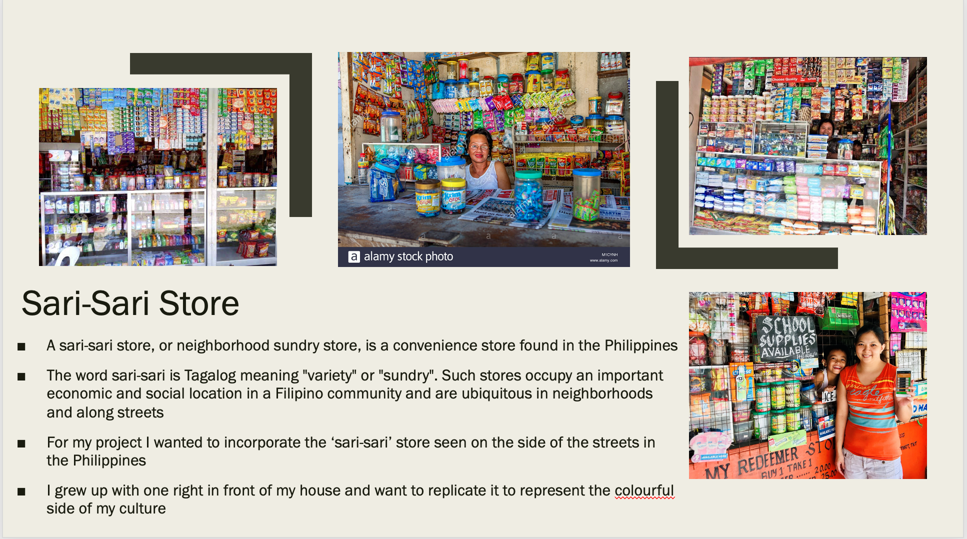 For the project I want to build a sari-sari store set in the studio to replicate this colourful convenient store seen in streets of the Philippines.