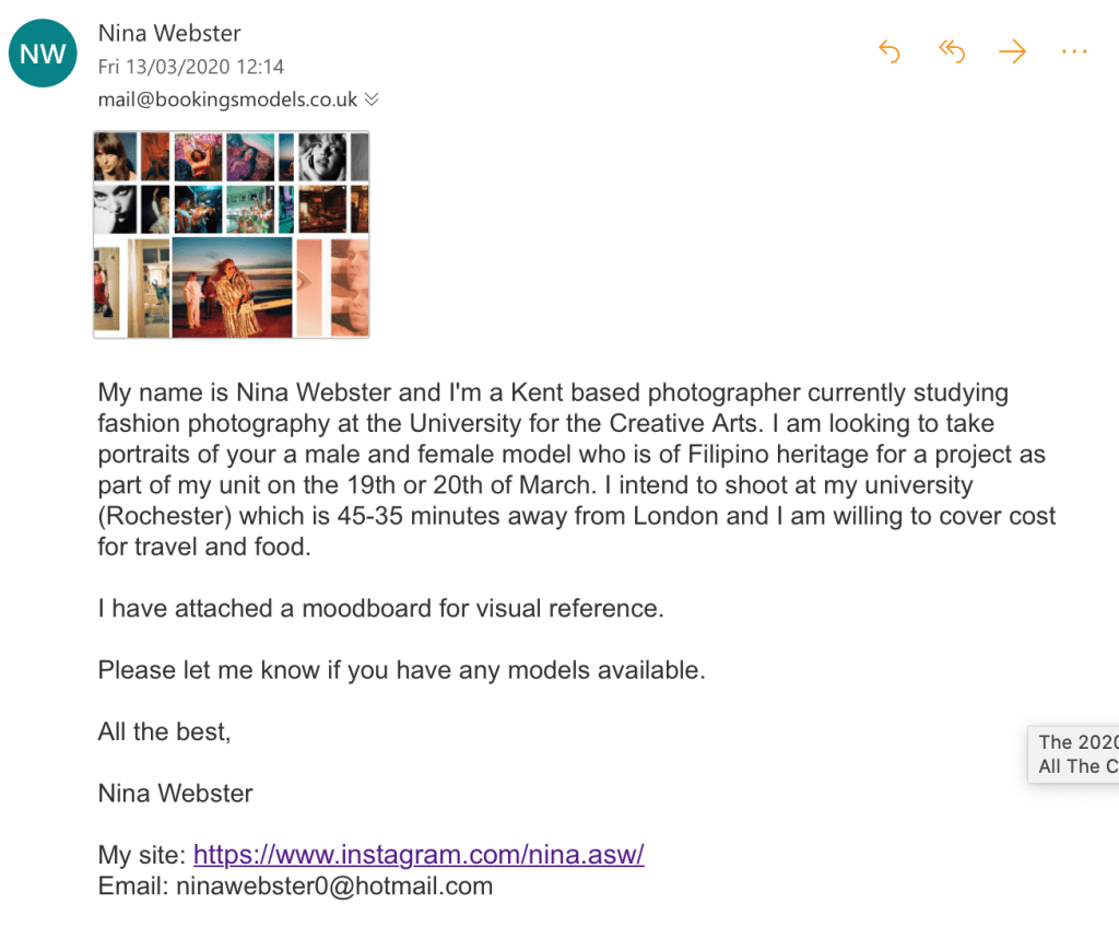 I made sure to give concise details about shoot, moodboard and contacts to give the agencies enough information about my proposed project.