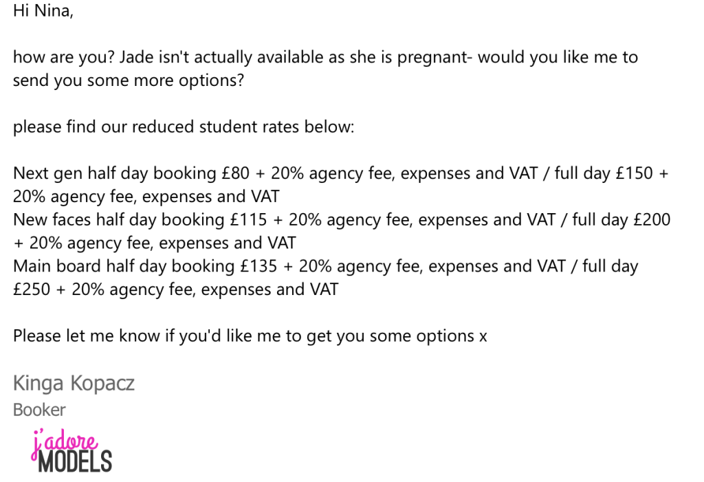 Although I’ve always wanted to work with j’adore models, the agency requires payment for any booking you do with them.