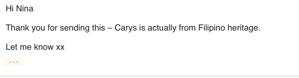 Above is a reply and a portfolio of the model the modelling agent, Ludovica, suggested for me. Carys is perfectly suited for my project as she is Filipino heritage and I needed a female model for my shoot.