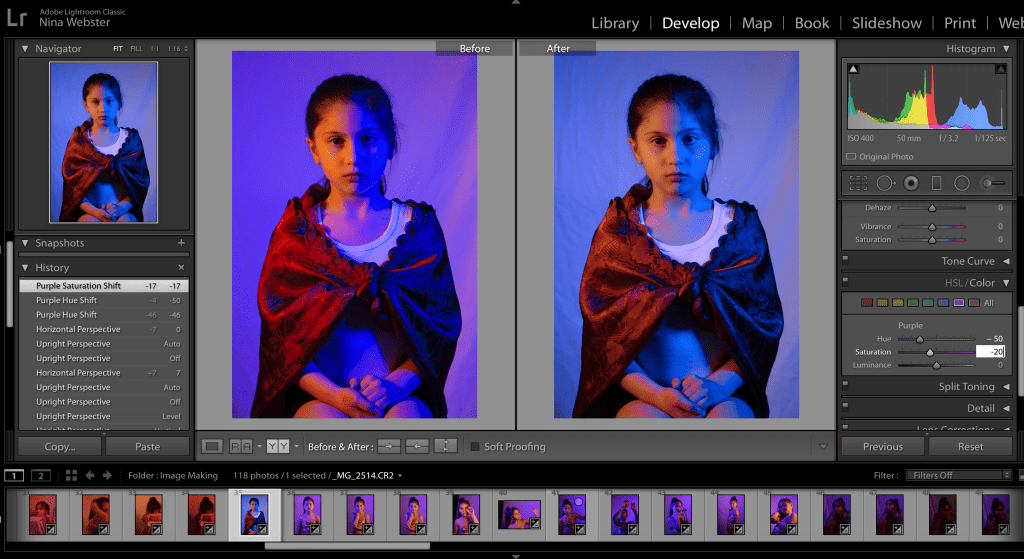 Firstly, I tweaked all the images in lightroom. I mostly focus on the predominantly blue-lit images to remove the purple hue.