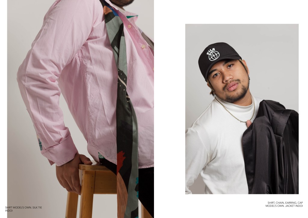 I was aiming for a minimalist look for my spreads so the message of having less clothes and supporting sustainable brands is visible throughout. These two pages reflect this message the most since there is enough negative space to give the images and text space to pop out. I purposely included the cropped image of the model’s clothing to show the audience the simplicity in his outfit. On the right, the model’s relaxed facial expression is to portray the weight lifted off his shoulder’s by applying sustainability in his wardrobe.