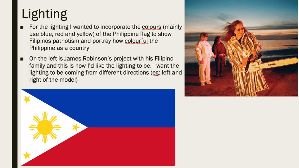 With my little sister’s shoot I managed to create more ways to play with the primary colours I wanted to use to represent the Philippine flag this is because she is more comfortable and was keen to model.