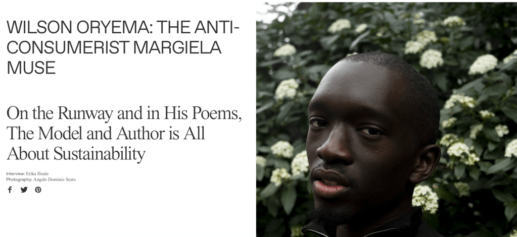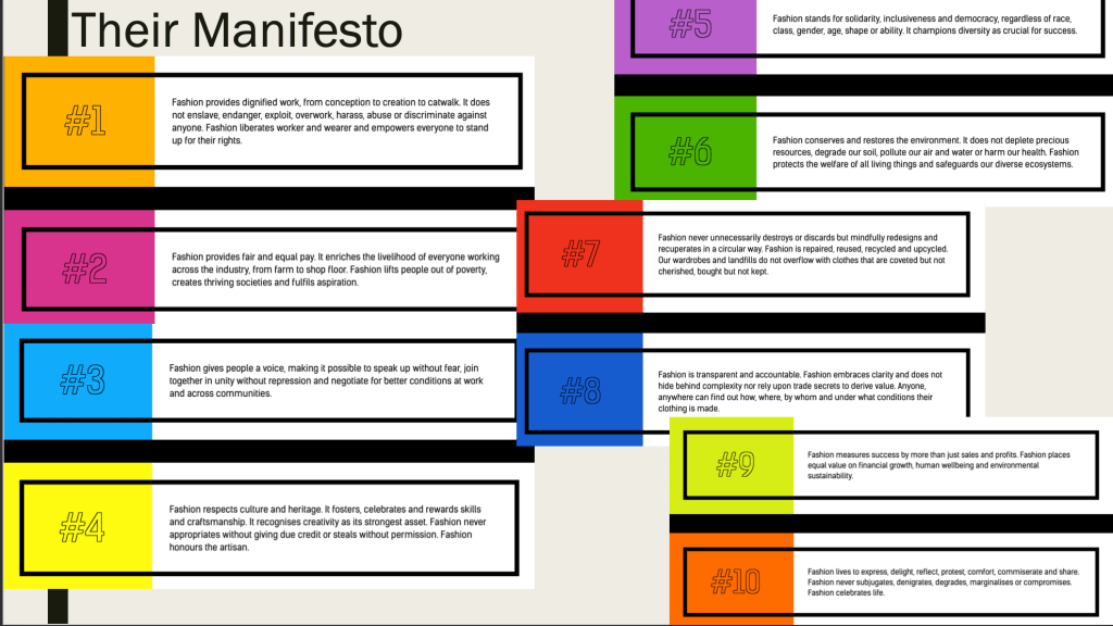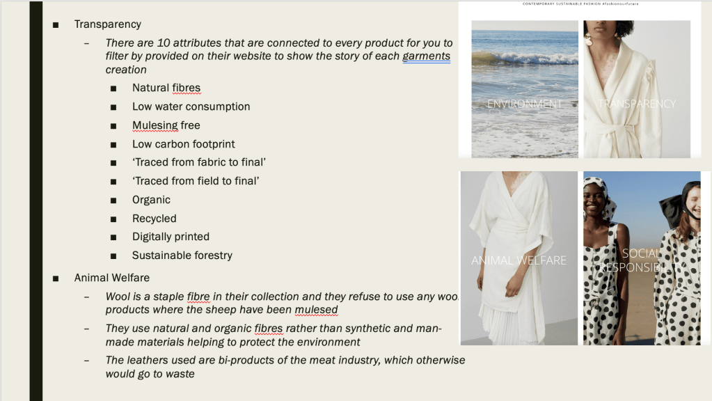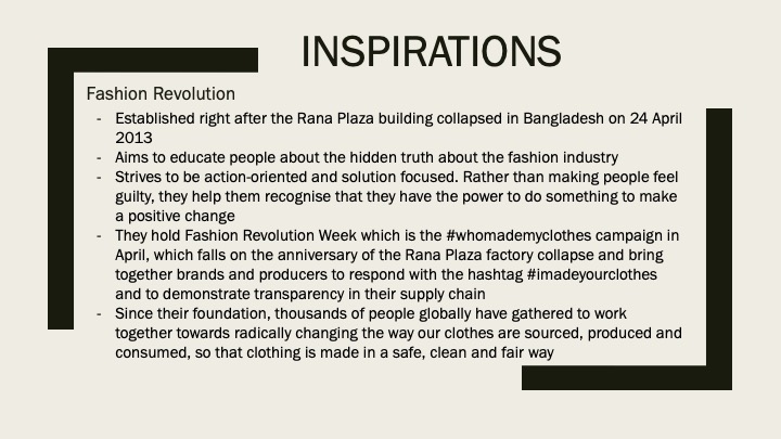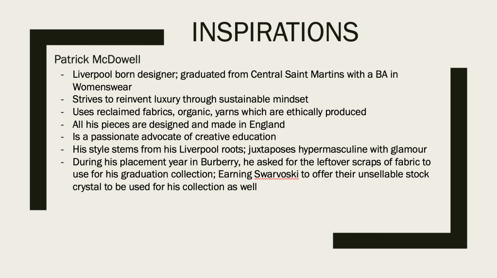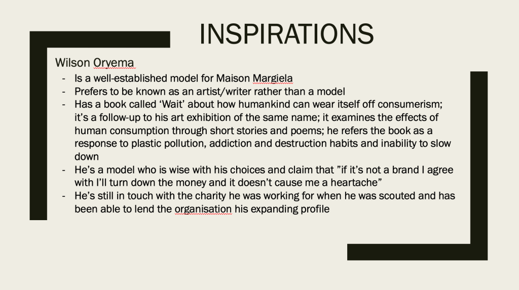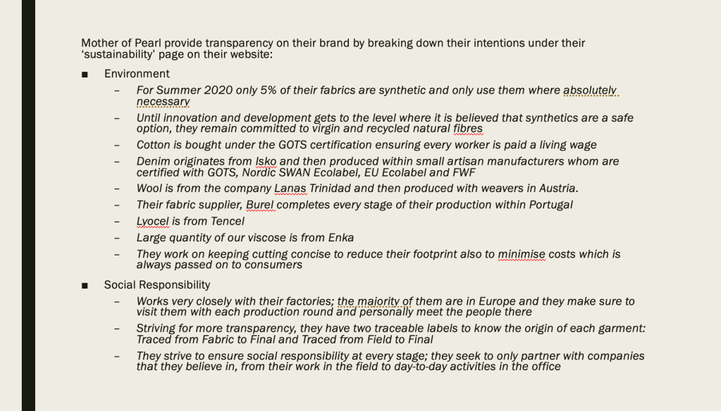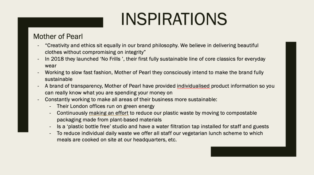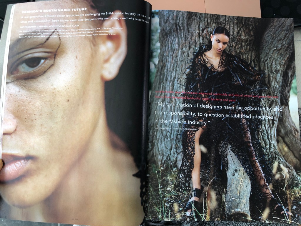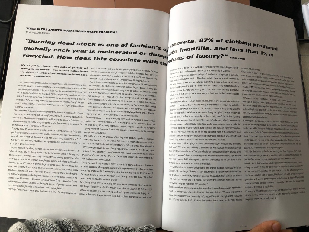Reading the book by British journalist and writer on environmental issues Lucy Siegle’s “To Die For: Is Fashion Wearing Out the World?”, the book provided me with a clear insight on how fashion is a polluting sector, examining the inhumane and environmentally devastating story behind the clothes we casually buy and wear. To further expand my knowledge, I looked at sustainable brand Mother of Pearl, eco-conscious designers and notable people, Wilson Oryema, Patrick McDowell and Kaan Amjad as well as organisation Fashion Revolution, founded to voice out the problems of the industry.