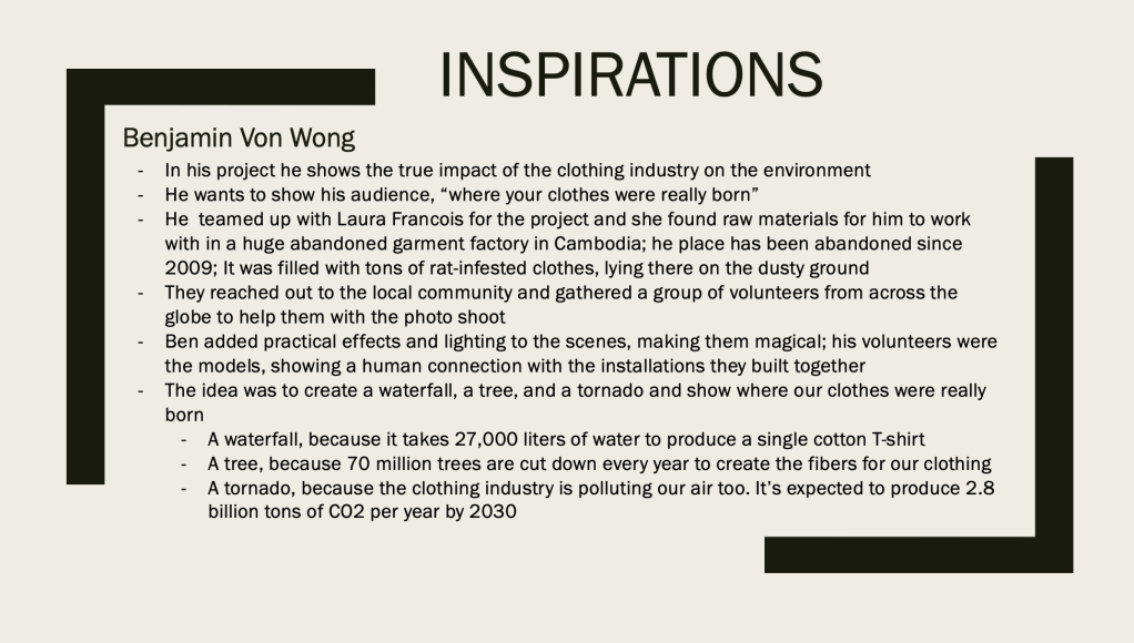 For my editorial shoot, my theme revolves around the sustainability behind fashion and more specifically how slow fashion is a step to a better future in the industry. As a fashion photography student, I felt that this topic should be tackled and show how you could possibly help combat the ever-polluting aspect of the fashion production through my medium. The way I portrayed this is by incorporating a sustainable brand, owned by our guest lecturer Mallika, and the idea of re-wearing your own clothes to show that you do not have to buy into the notion of trends put out by companies to make you follow the cyclical cycle of buying and throwing away your garments.
